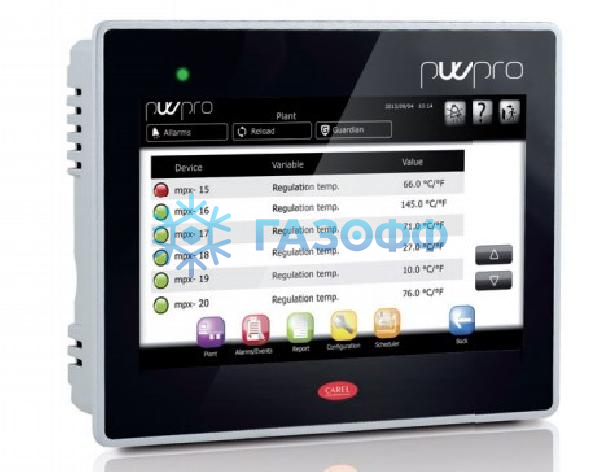 Контроллер системы диспетчеризации PlantWatchPRO от Carel, артикул PW3P000TP000. Имеет сенсорный дисплей, подключение до 15 устройств, работа со 100 переменными. Монтаж в панель. Поддержка протоколов Carel ModBus.Напряжение питания 24В, 50/60Гц переменного тока.
